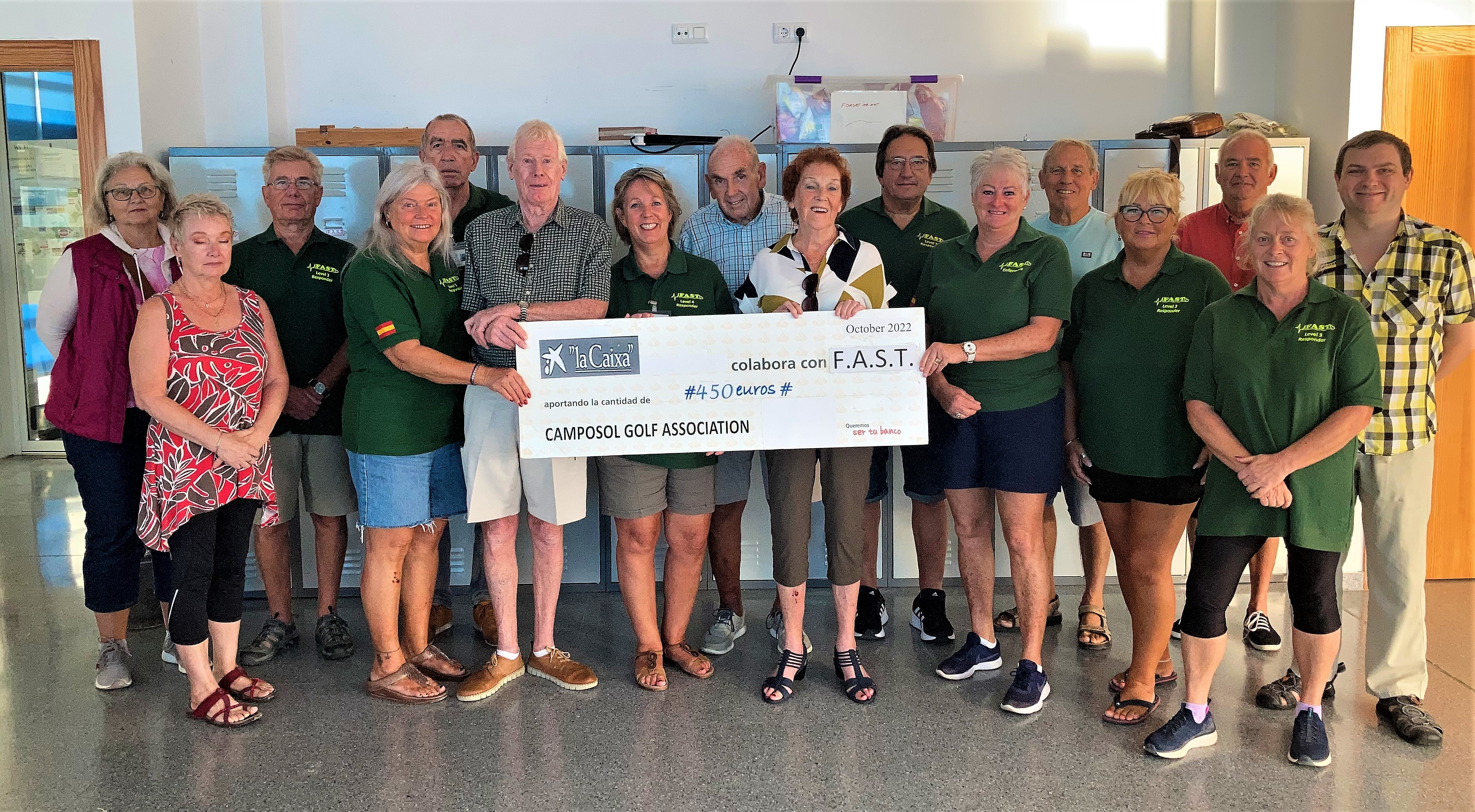 On Tuesday 11th October 2022 The Camposol Golf Association presented FAST with a cheque for 450 Euros. This was a share of the proceeds from two charity quiz nights that the Camposol Golf Association had run at the Golf Club House.